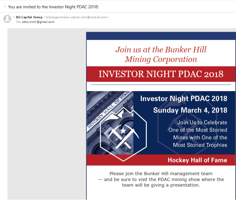 Bobby Genovese and BG Capital Group just sent me over an RSVP invite for the Bunker Hill Mining bash at PDAC on Sunday. And that's a good thing: